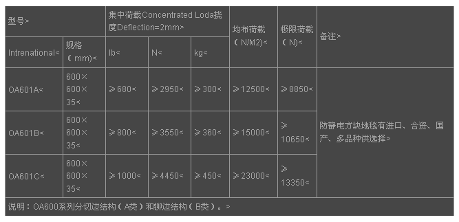 OA600智能化网络全钢高架活动地板铺设后,可随时布线,并可任意拆卸,无需专业人员帮忙。与一般地板相比,OA600地板除了经济性外,任何时间均可解决您所面临的综合布线问题,并且强度大,寿命长。OA智能化网络全钢高架活动地板技术参数(600系列)注:1.活动地板铺设高度可在50-1000mm范围内任选。2.支架承载能力不低于20KN,并可与各种型号活动地板匹配。深圳91直播看片地板有限公司制造工厂建在广东东